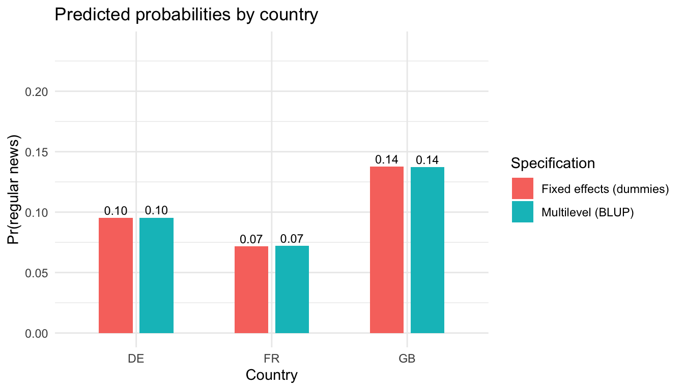 icc <- var_u0 / (var_u0 + pi^2 / 3)Intraclass correlation (ICC): 2.58% of the variance in the log-odds of regular news use is at the country level.