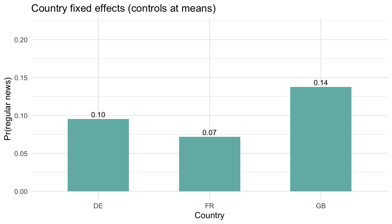 news_regular ~ agea + gender + eduyrs + country - Interpretation: Country coefficients capture average gaps relative to the reference country (DE, alphabetically first).
