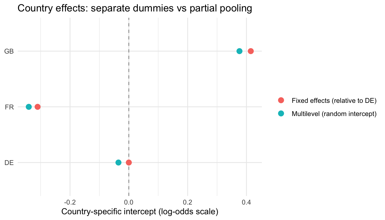 - Multilevel (random-intercept) logistic regression: partially pools country effects, reducing noise for small samples and enabling variance decomposition.