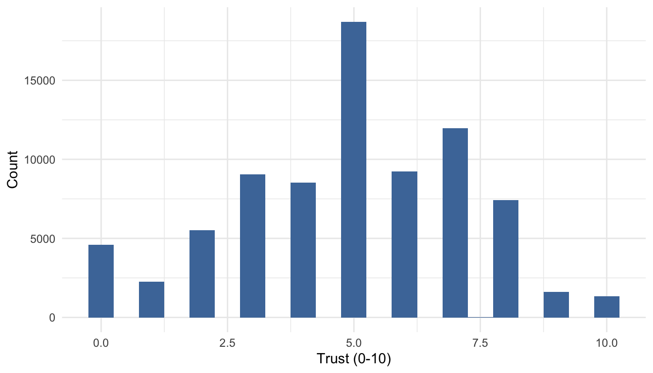 labs(x = "Trust (0-10)", y = "Count") + theme_minimal()