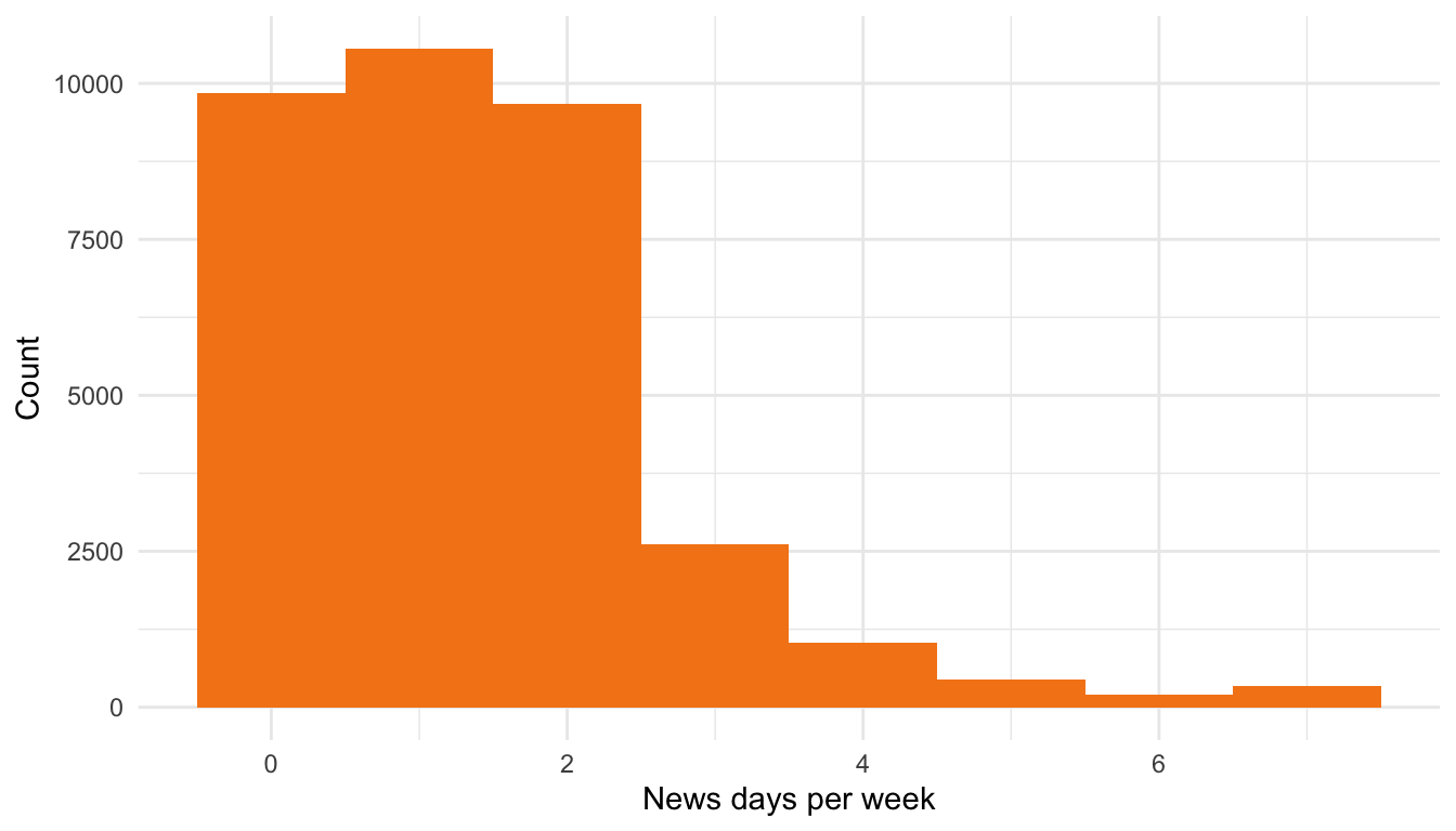 labs(x = "News days per week", y = "Count") + theme_minimal()