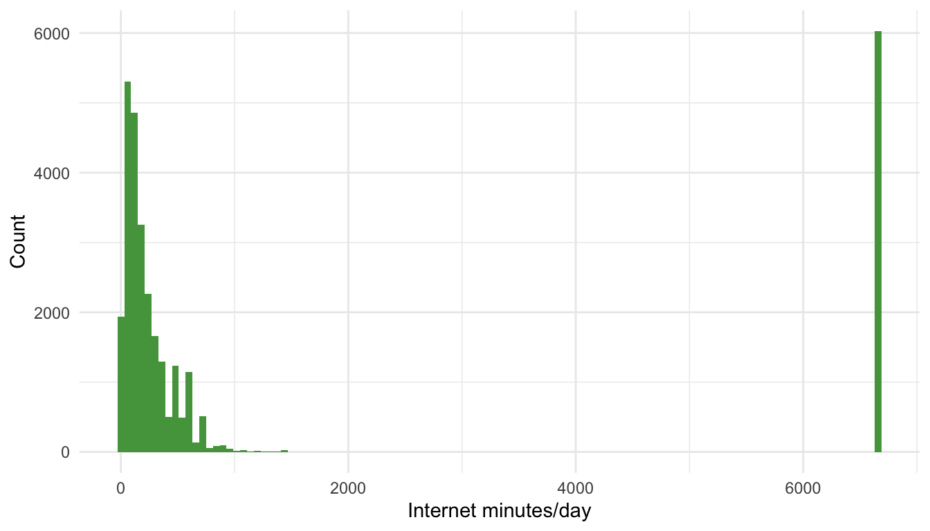 labs(x = "Internet minutes/day", y = "Count") + theme_minimal()3.5 Problem set A — Univariate summaries