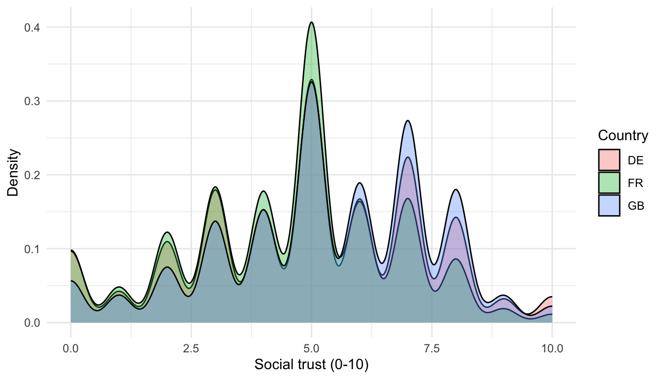 labs(x = "Social trust (0-10)", y = "Density", fill = "Country") +