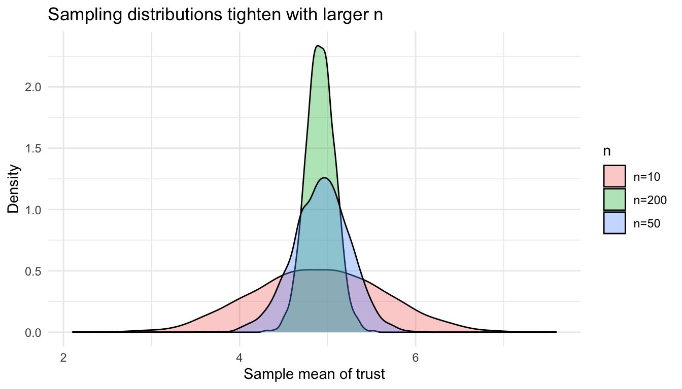 - Sampling model: estimates come from a sample → always uncertainty. Sampling distributions tell us how much an estimator would vary across repeated samples.