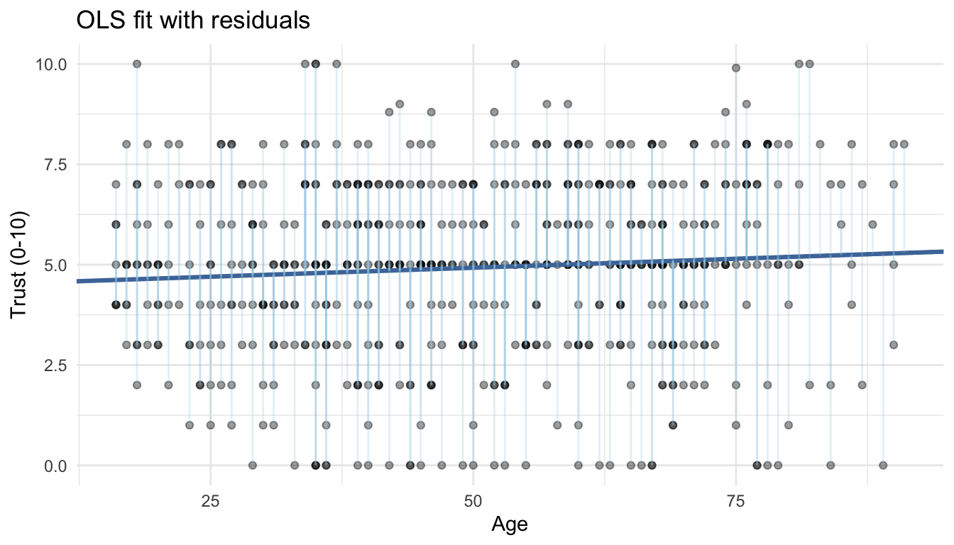 labs(x = "Age", y = "Trust (0-10)", title = "OLS fit with residuals") +