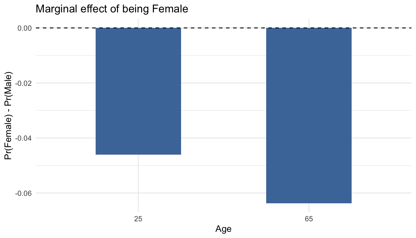 labs(x = "Age", y = "Pr(Female) - Pr(Male)", title = "Marginal effect of being Female") +