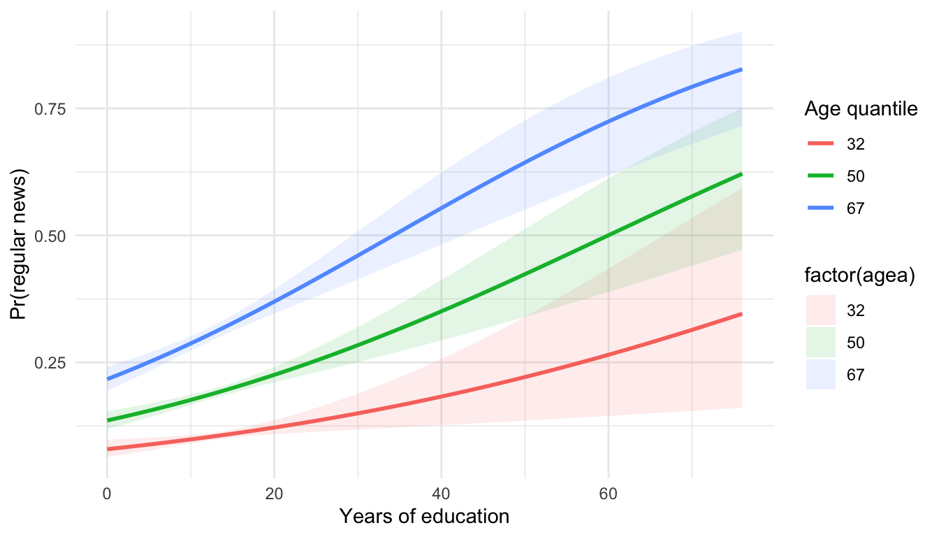 labs(y = "Pr(regular news)", x = "Years of education", color = "Age quantile") +