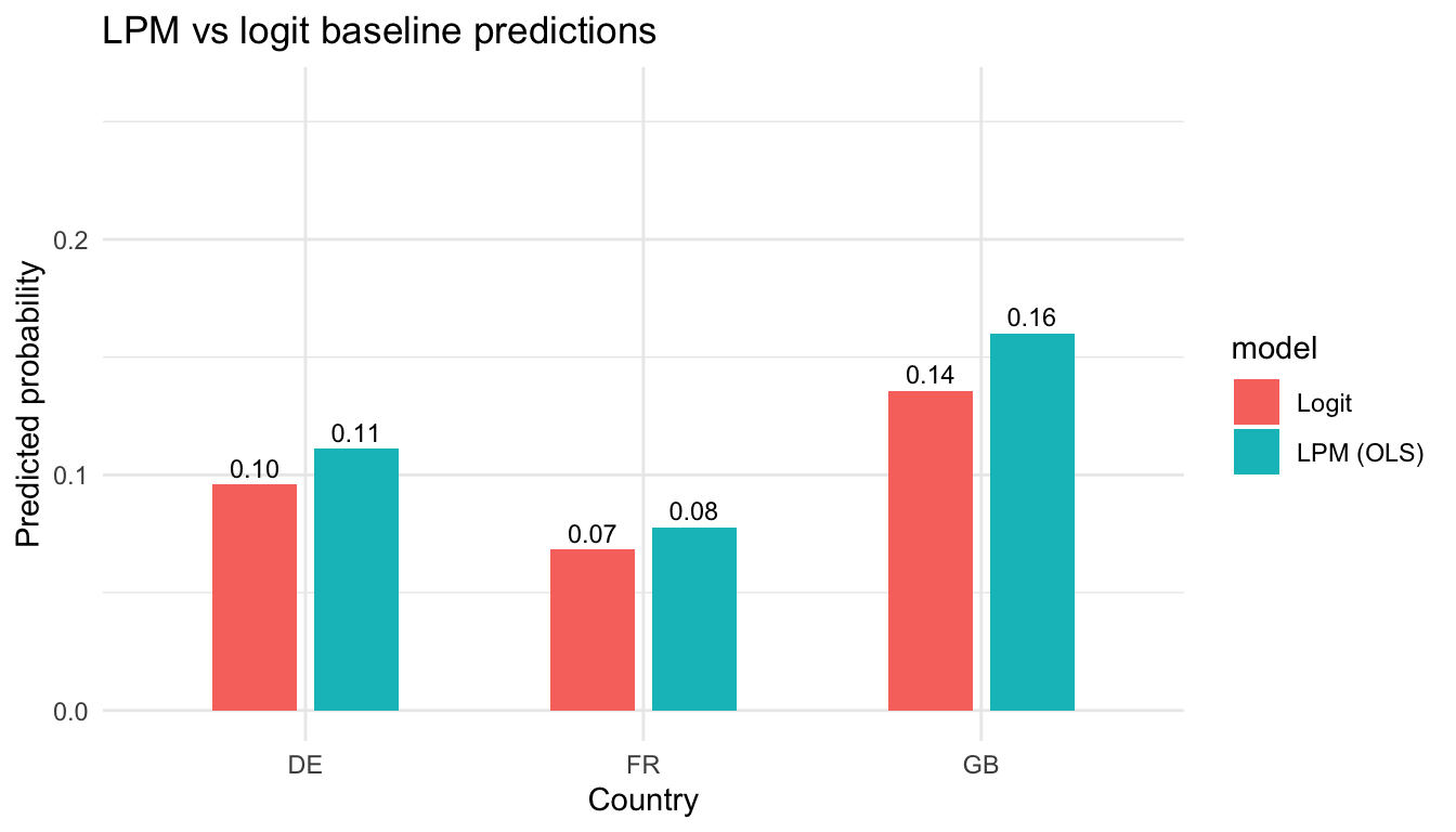 logit4andlogit5using AIC and pseudo R² (pscl::pR2). Which balance of complexity and fit seems reasonable for classroom examples? - For one model, translate results into plain language for a non-technical audience: choose two profiles (e.g., 30-year-old woman in GB vs 60-year-old man in FR) and report predicted probabilities.